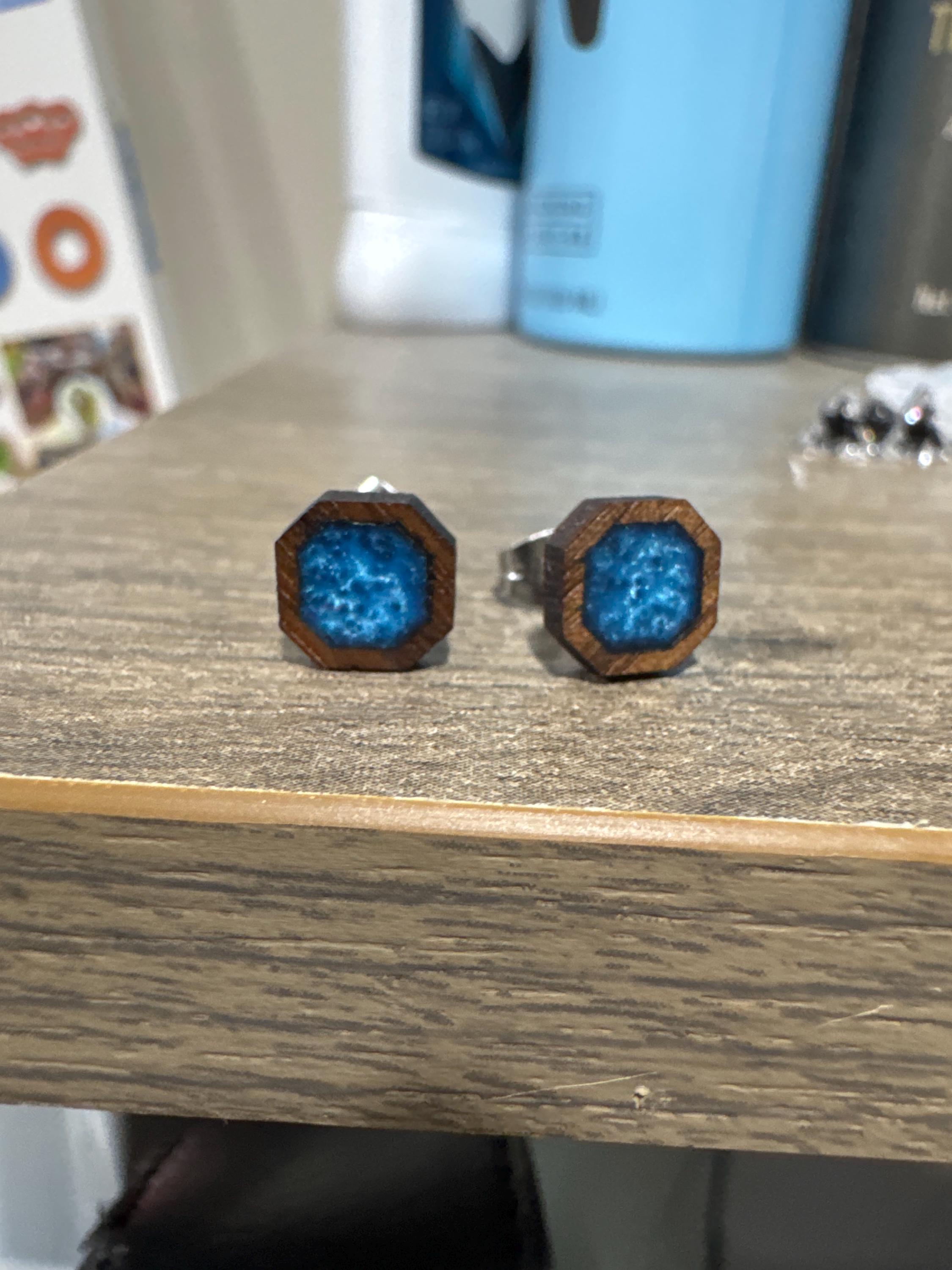 Handmade from black walnut wood, these natural stud earrings are unique in character and will stand out with an Ocean Blue translucent resin center. We make each set by hand, polish, then seal them with a protective coating. They are strongly bonded to hypoallergenic (nickle-free) posts.